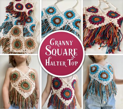 HALTER TOP SIZES: S - 3M-2Y (chest 14" - 18" ) M - 2-6Y (chest 18" - 23" ) L - 6-9Y (chest 23" - 26" ) PDF CROCHET PATTERN includes: - 34 page printable pdf - US terms - yarn amounts/quantities - yarn colours - stitch glossary - full written instruction for the granny square used - full written instruction for JAYG (Join-As-You-Go) technique - full written instruction for a cord - full written instruction for 3 different sizes