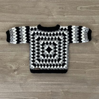 Create a striking crochet sweater in eight sizes from 0–3 months to 12 years, designed as a comfortable everyday jumper. Made from two large granny squares joined together, with rounds added for sleeves and body. A unisex style for boys or girls.