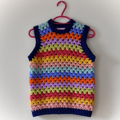The granny stripe vest is the perfect piece to pair with any outfit, for any season! This pattern uses acrylic yarn but it could easily be switched out for cotton, making it more wearable in warmer weather. I often style mine over other pieces but it also looks great on its own! This pattern shows you how to make sizes XS-5XL. It is a tight-fitting piece that can be made oversized by going up a size or two. The colour options are endless! You could even go with one solid colour to make a more classic piece. I have said this pattern is intermediate, however I do think it is beginner-friendly! I use lots of pictures to make each step easy to understand. This pattern is written in U.K terms.