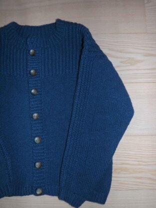 This is a cardigan knitted from the bottom edge and up with modified drop shoulders and long sleeves. The cardigan has a traditional textured pattern on the shoulders and matching stripes on the sleeves. The pattern is made for at yarn with a gauge of 18 stitches per 10 centimeters (stockinette stitch). The pattern includes directions for making a long and a shorter version of the cardigan. The pictures shows the short version in Sandnes Peer Gynt / Mor Aase.