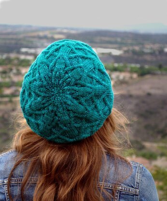Great Hall Beret features a lattice cabled pattern. Knitted in the round from the brim up.