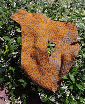 This scarf has an all-over zig-zag pattern worked in doubleknit. It can be a challenge. It's difficult to tell "front" from "back" while you're working it. Something to help identify the start of odd number rows can be helpful.