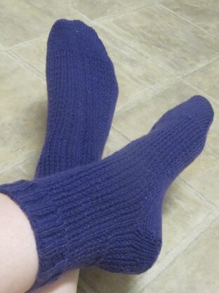 Wide range of sizes for men and women. Instructions for both Deborah Norville Serenity Garden fine weight yarn and Loops & Threads Woolike superfine weight yarn. Gauge for woolike: 32 stitches x 44 rows= 4". Pattern uses only basic stitches, so it would be fun for the newer sock knitter. Socks knit pretty quickly and feature a nice textured fabric. NOTE Sizes will run large for the Serenity Garden yarn. Both versions are written for DPN's. I have also used Mary Maxim Step Softly,Cascade Heritage Solids and Red Heart Heart & Sole yarns with good results. All will knit up smaller than the Deborah Norville and larger than the Loops & Threads.
