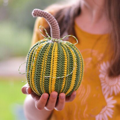 The pumpkin is approximately 9 cm / 3.5“ (the stalk is 8 cm / 3.1“) if you use specified yarn and hook. The pattern can also work well with the yarn of other weight, but the size of the finished crochet toy will be different.