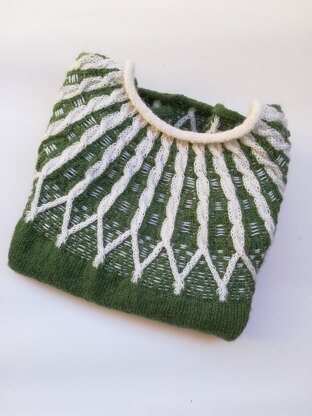 Sweater is knitted top down with basic 2 colors fairisle technique and 4 stitches left cables +3 stitches moving cables.