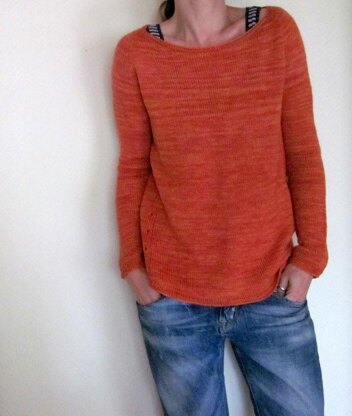 This modern, everyday pullover features a slightly rounded hemline with a singular row of eyelets defining the subtle A-line shaping at each side. The lightweight stockinette stitch and graceful open neckline makes this great sweater wearable year-round.