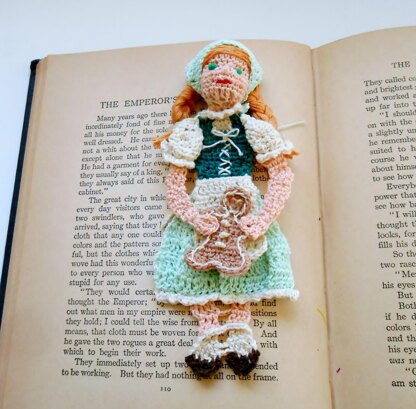 Do you love the story of Hansel and Gretel? Here is Gretel holding a gingerbread cookie that you can crochet into a bookmark. Or put your new creation in a shadow box for any area on your walls that need a little Grimm’s Fairy Tale décor.