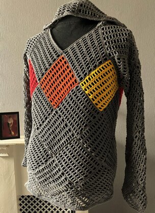 This crochet pattern is for a men's v neck shirt, made with a grid square. You will receive instructions on how to make a shirt with or without a hood, and with or without sleeves.
