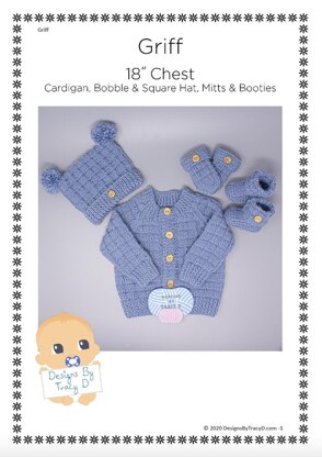 Griff is a Baby Knitting Pattern suitable for a baby boy or baby girl and has a cardigan, 2 styles of hat, a square hat or a bobble hat, mitts, and booties to fit a baby 18" chest made using 200g of DK yarn and 3.25mm & 4mm needles. 5 buttons are required for the cardigan.