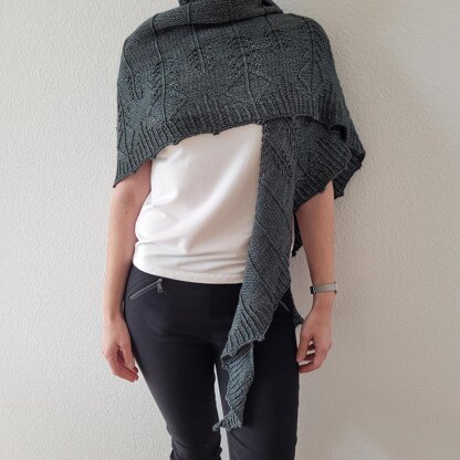 This shawl is a combination of heart shaped shawl and a triangle. The wings will grow faster so that you´ll get a big shawl with less deep in front. The pattern starts with lines which look like eave veins, which creates some flower-like structures in second part. The ribbed border with optional picot bind off gives this shawl a unique touch.