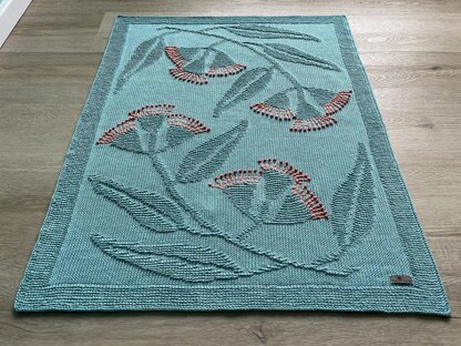 This Tunisian crochet blanket features beautiful gumnut blossoms and leaves. The design is created using Tunisian reverse stitches and Tunisian knit stitches. The blossoms are embroidered on using a contrast colour yarn after the blanket has been crocheted and blocked.