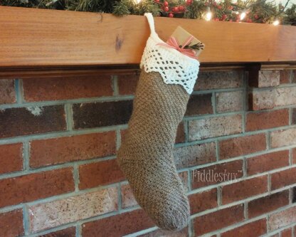 This is my take on the popular burlap and lace Christmas stockings but in knitted form! The “burlap” is a simple, easy-to-memorize textured pattern and the lace cuff is knit separately and sewn on. It is knit in the round from the toe up with an after-thought heel.