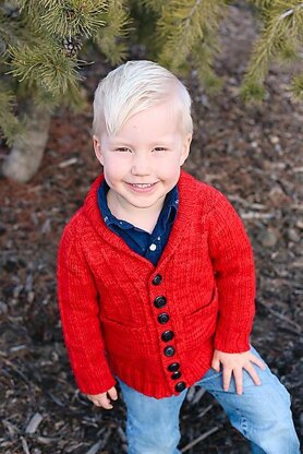 Gus is a shawl collar cardigan with slipped-stitch detailing throughout. It is knit seamlessly from the top down with raglan shaping. The collar is picked up and shaped with short rows. Two pockets are knit along with the body of the sweater.