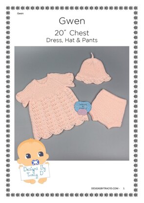 Gwen s a Baby Knitting Pattern for a pretty short-sleeved dress, a pixie style hat and matching pants to fit a baby 20" chest and is made using DK yarn. The Pattern requires 200g of Dk yarn to make the set, and it is knitted using 3.25mm and 4mm needles.