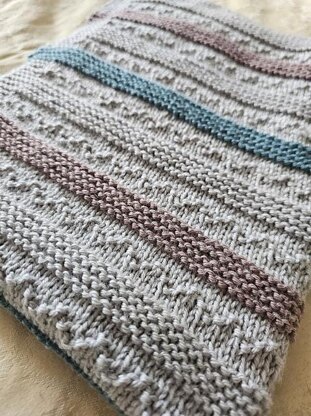 A simple textured blanket which allows for TV knitting. The sections give interest and the stripes allow usage of any scraps of yarn left over.