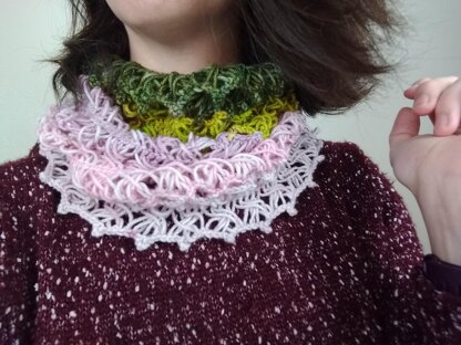 This pattern uses hairpin lace and 5 DK mini skeins to create a fun lacy cowl. This cowl uses a join as you go technique and features picot edging on the top and bottom. It's a great scrapbusting pattern since it uses less than 20g per color. In addition to the yarn, you'll need a size G (4.0mm) crochet hook and a hairpin lace loom.