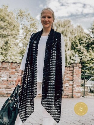 Das schlichte Muster, die imposante Größe von 230 cm Länge und 50 cm Breite und die interessante Form machen dieses Stück vielseitig tragbar.