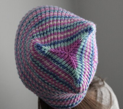 On the Jewish festival of Purim, it’s traditional to eat delicious three-cornered cookies called hamantaschen, meant to resemble the three-cornered hat of Haman, the villain in the Purim story. I have fond memories of baking dozens of cookies, and I also can remember my mother singing a song that went “Hakova sheli shalosh pinot,” or “My hat has three corners.” When I first knit up the crown for this hat, I couldn’t help but see the resemblance—and I also promptly got the song stuck in my head.