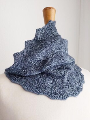 The cowl uses less than a skein of fingering weight yarn. Choose a smooth yarn that will block well; silk content is recommended for drape and sheen.