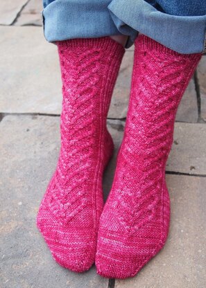 Half Hearted features a stacked heart cable running down the front, and ribbing around for a snug, stay-up fit. These are intricate enough for accomplished knitters, and good for adventurous beginners or those new to cables.