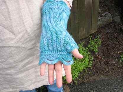 The whole mitt is joined as you go so there are only the beg and ending yarn ends to darn in, and no little pieces to loose themselves in your workbag. Since the mitts stop before the fingers, there is no need to offset the thumb, so the left and right are identical. Ch 2 turning chain does not count as a stitch.