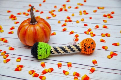 Crochet a Frankenstein baby rattle for your little one this Halloween. The Frankenstein head sits atop a spiral striped handle, and the other end of the rattle is a colorful Jack o'Lantern. Also makes a great baby shower gift or photography prop for baby's first photo shoot.