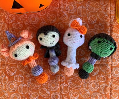 Detailed Pattern with photos and links. Pattern is 17 pages. Pattern includes Baby Vampire rattle, Baby Frankenstein rattle, Baby Witch rattle, Baby Ghost rattle