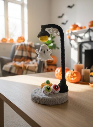 This spooky-cute design features a little ghost that hovers mysteriously under a streetlamp, with a pumpkin and eyeballs at the base for extra charm.