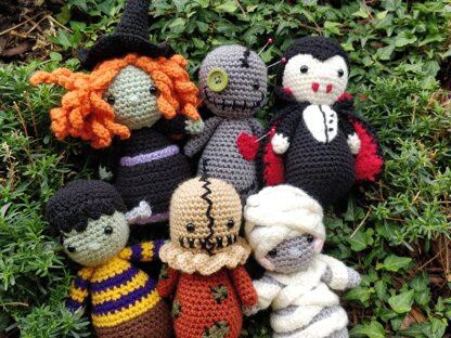 Included patterns: - Dracula - Frankenstein's Monster - Mummy - Scarecrow - Voodoo Doll - Witch The dolls will be about 18-19 cm long (the witch is about 25 cm long) (using Aran weight yarn). The patterns are written in English (US) using US terminology