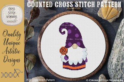 An Adorable Halloween Lollipop Gnome counted cross stitch design!\nCross Stitch Pattern designed by Marcia Manning.\nDesign is 60 stitches wide by 102 stitches high.\nPDF is a COLOR counted cross stitch chart which lists suggested DMC floss colors, and includes a color picture.\n\nStitched design size is as follows:\nSize 11 count: 5.45 x 9.27 inches or 13.85 x 23.55 cm\nSize 14 count: 4.29 x 7.29 inches or 10.89 x 18.51 cm\nSize 16 count: 3.75 x 6.38 inches or 9.53 x 16.19 cm\nSize 18 count: 3.33 x 5.67 inches or 8.47 x 14.39 cm\nSize 22 count: 2.73 x 4.64 inches or 6.93 x 11.78 cm