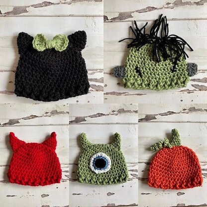 This Halloween hat collection features a basic beanie pattern in 3 sizes, with a collection of features that allow you to create a kitty, a devil, a pumpkin, an alien, or a Frankenstein monster. Pattern also includes a little bow, which can be added to any hat. Suggestions are also given for additional sizing adjustments. These character hats work up quickly, and are perfect for a seasonal gift, photo shoot, or adorable pregnancy or birth announcement. You'll want to make them all!