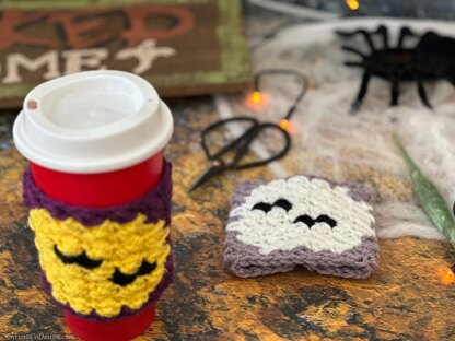 Create a Halloween themed cup cozy with this free crochet pattern. The full moon and flying bats are easy to make with color changes. The basic cozy pattern is a simple one row repeat in a textured stitch pattern. I chose to use acrylic yarn but you could use cotton yarn if you prefer. Video tutorial link included.