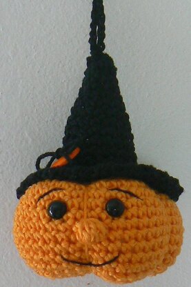 This is a sweet little Halloween pumpkin key chain pattern. The key chain is about 8 cm (about 3 inches) plus the loop (15 cm/ 6 inches including the loop and snap hook).
