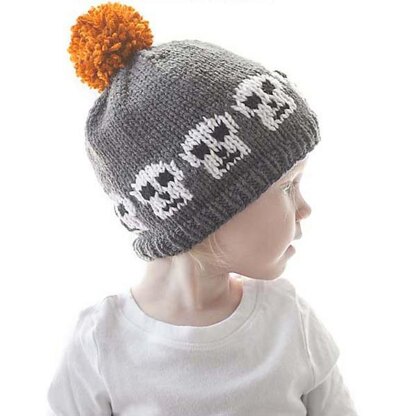My adorable Halloween Skull Hat knitting pattern is a quick and easy knit with just a few rounds of stranded fair isle knitting to make these adorable skulls around the brim. This cute hat is perfect for you newborn, baby or toddler to wear for the entire Halloween season and it looks extra festive with a fluffy orange pom pom on top! Add some cute pjs and your baby's Halloween costume is done! This cute baby hat knitting pattern is knit in the round.
