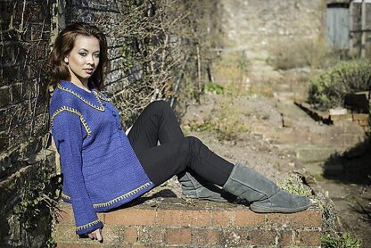 Construction: The sweater is knitted in one piece from the bottom up, then separated at the armholes for the fronts and back to be worked separately. Sleeves are picked up around the armhole and worked downward in the round. It has gentle waist shaping. Instructions are included for the simple blanket stitch embroidery trim.