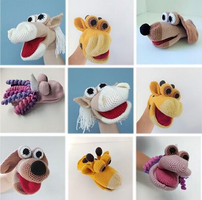 This listing bundle includes four original patterns to crochet your own Set of Amigurumi Hand Puppets. It Includes A Dog Hand Puppet, Giraffe Hand Puppet, Horse Hand Puppet and Unicorn Hand Puppet.