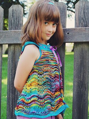 This pinafore is designed to maximize the yardage and accentuate the beauty of handspun or otherwise extraordinary yarns. With its sleeveless yoke and a-line lace body, it makes the most of a small amount of yarn. Undulating waves and graduating garter ridges highlight the unique textures and long color transitions often found in handspun and artisan dyed yarns.