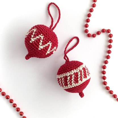 Made with DK (light worsted weight, Category 3) yarn and a 3.5mm (US size: E-4) hook, the finished ornaments are approximately 6cm/2.5 inches in diameter. Make larger or smaller ornaments by choosing a different yarn and hook.