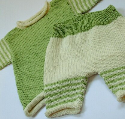 This little outfit, designed for Hannah’s baby, is traditional with a twist! Stripes add a fun element! The little top is knit bottom up, in one piece, only seamed at the shoulders, kitchener stitch could be used. The pants are knit top down, almost seamlessly, from an adjustable waistband, with short row shaping at the back. The smaller sizes are suitable for a baby boy.
