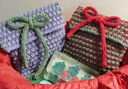 Hannah's Gift Bag/Bath Mitt is knit in one piece, using a simple slip stitch pattern.
