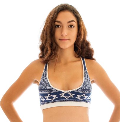 Get in the Hanukkah spirit with this Star of David motif bralette knitting pattern designed to hug your curves in all the right places. It is based on the clothing brand Knitty Kitty. Playful pieces that are fun to knit and sexy to wear. Great as loungewear, for yoga, sleep, to festivals!