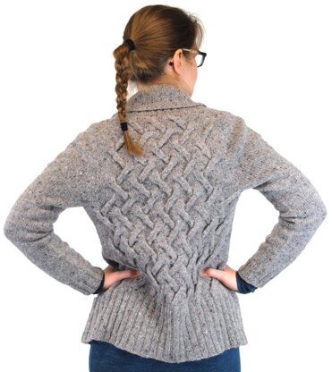 Happenchance is a contiguous top-down V-neck cardigan that combines a classic grandpa-cardigan look with hidden details. The back of the garment features an elaborate cable pattern that makes a striking contrast to the simpler front. The cardigan also includes practical forethought pockets cleverly concealed within the deep ribbing at the hem. A wide shawl collar frames the neckline, keeping your neck warm while adding a touch of casual sophistication. Subtle A-line shaping creates a comfortable and relaxed fit.
