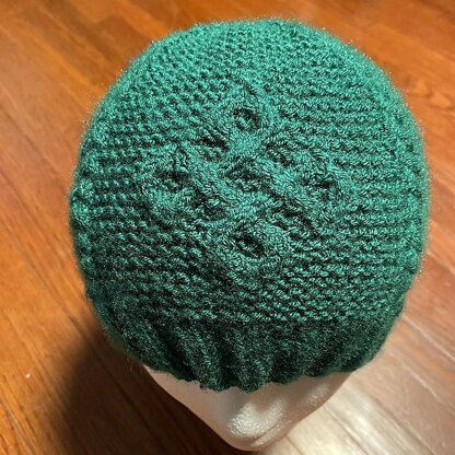 PATTERN DIFFICULTY LEVEL: Intermediate; skills required include: cables on a garter st background, lifted increases, working in the round, & decreases