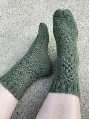 These socks were inspired by the happiness symbol, or St. John’s Cross, which Elsebeth Lavold discusses in relation to Viking artifacts in her book, Viking Patterns for Knitting: Inspiration and Projects for Today’s Knitter. Here, the happiness symbol adorns the leg on a background of garter stitch. Braided cables flank the happiness symbols and continue to the toe. Happiness Socks are knit cuff-down and feature a reinforced slip stitch heel flap and gusset.