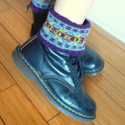 This is a pattern for a pair of welly toppers or boot cuffs. They are knit from the inner cuff up to the decorative Fair-Isle trim.