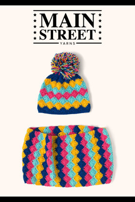Be inspired by all the fun of the carnival! Bright and breezy, the Harlequin Set is a simple-to-work crocheted hat topped with a pompom and cozy cowl using basic stitches in gorgeous, carnival colors. Worked flat, these two projects are ideal for beginners who are ready to move on to combining stitches to create shells, using increases and decreases to form bright Harlequin diamond motifs. Main Street Yarns Shiny & Soft Worsted is gorgeously soft in premium acrylic, with a color palette of vibrant, jewel shades. Come join the circus!
