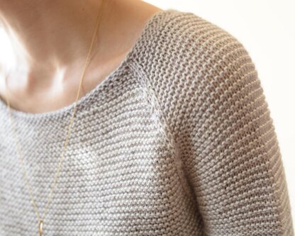 This is a comfy, stylish pullover with 1-rnd stripes on the upper body and sleeves. The body and sleeves are worked from the neck down in one piece to the underarm in garter stitch. The sleeves are then set aside and the body is worked in reverse Stockinette stitch with waist shaping, and the hem is worked in garter stitch. The sleeves are worked down in the round in reverse Stockinette stitch and the cuff in garter stitch.