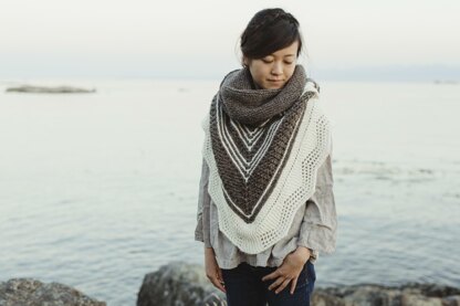 Worked in two colours of Hinterland Range, the Haro shawl is a stunning composition of openwork, texture, and colour shifts. The fabric of this generously-sized shawl is soft and cozy, with repeated stripes that create beautiful swirls reminiscent of cascading waves when wrapped for warmth. Haro’s unique construction comes together with separate sections for borders and edges worked in different directions. This clever engineering makes for a dynamic and engaging project.