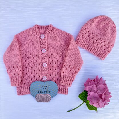 This is a unisex Baby Knitting Pattern for a round-neck Cardigan, Hat, bonnet and booties. The cardigan hat and booties are in two sizes, 0-3 months & 3-6 months, using DK yarn but with different-sized needles. They use DK yarn with 3.25mm &4mm, or 3.75mm & 4.5mm needles. You will need 150g of DK yarn for each size. I used Sirdar Snuggly DK.