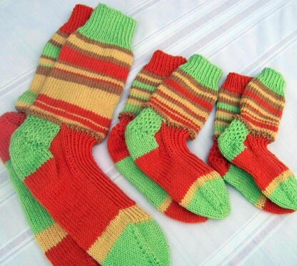 The pattern comes in four sizes: S, M, L, XL Finished sizes: 6½ (8, 9½, 11)” / 16.5 (20.5, 24, 28)cm foot circumference and 6½ (8, 10, 12)” / 16.5 (20.5, 25.5, 30.5)cm foot length from back of heel to tip of toe.